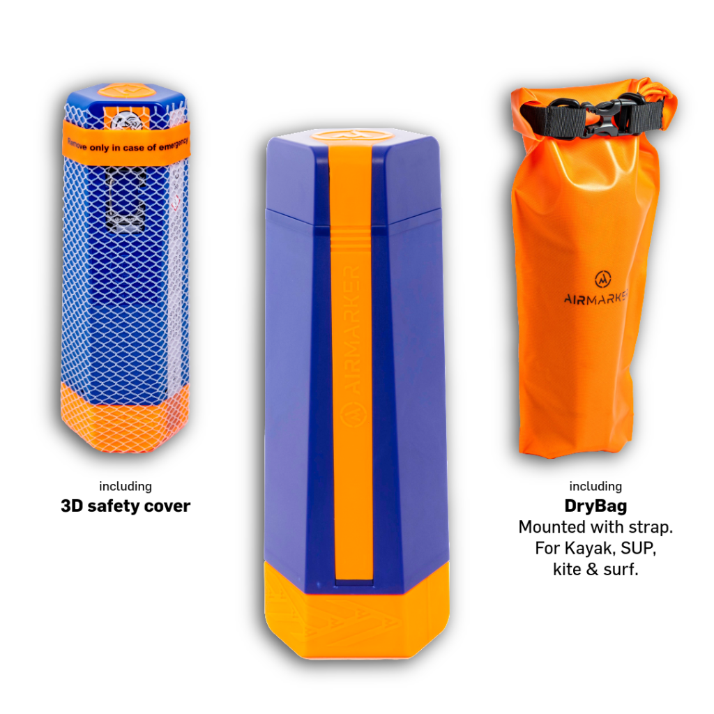 AirMarker R.Four încape ușor în echipamentul individual pentru sporturi nautice. Se activează în câteva secunde, iar culoarea vizibilă și capacitatea de a pluti la înălțime îți sporesc siguranța pe apă. În caz de urgență, balonul luminos poate urca până la 5 metri. Carabiniera permite fixarea sigură de echipamente, vestă de salvare, placă de surf, barcă gonflabilă sau canoe. Este livrat într-un sac impermeabil (Dry Bag). Balonul are un strat special care îmbunătățește detectarea radar, însă aceasta poate varia în funcție de condiții. Totuși, în multe cazuri ajută echipele de salvare să localizeze mai ușor persoanele.
