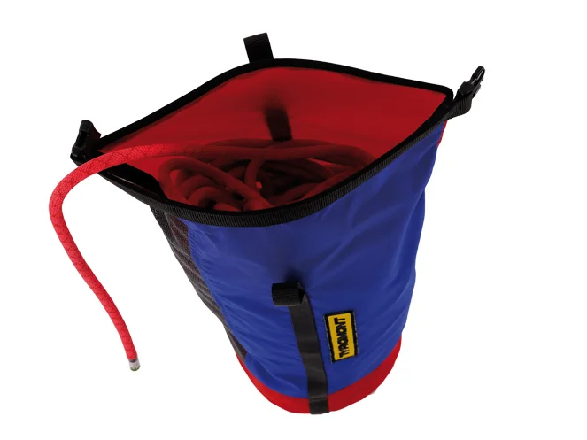 Husă ultrausoara de depozitare, transport si utilizare a unei corzi de pana la 60 m prevazuta cu inserție din plasă pentru aerisirea sau uscarea ușoară a corzii.